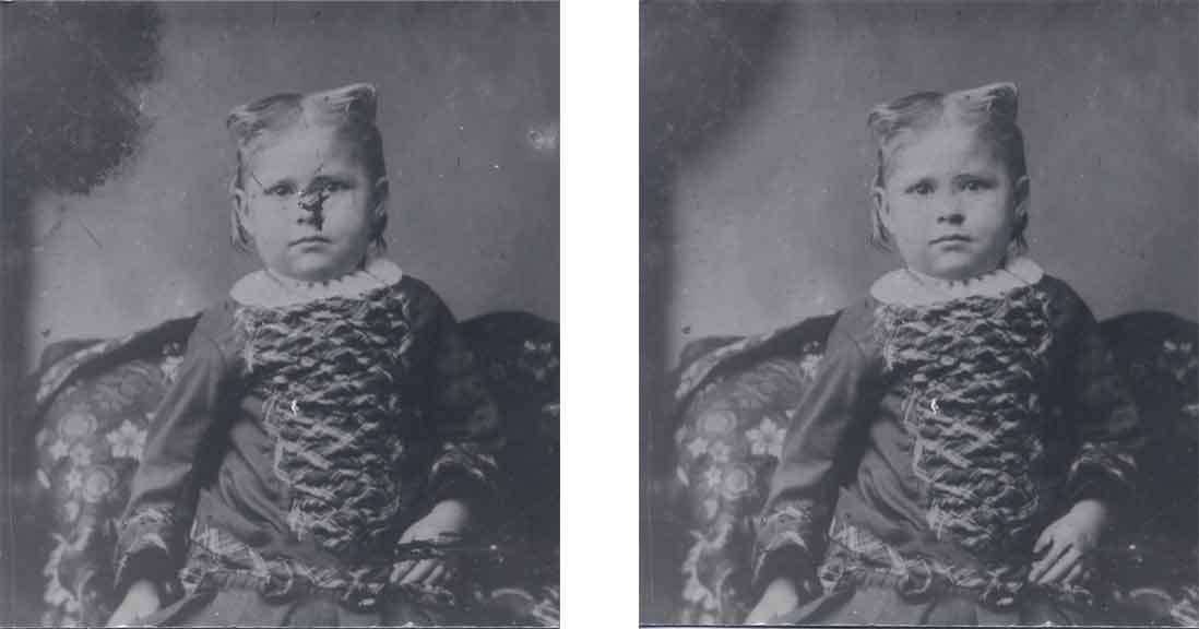 Some minor photo repair work is included in the price of an album or page. If you want more than minor work on a photo, we will discuss what should be done. Then I'll give you a quote for the cost of that work. Please be aware that, on photos where the color of the original is correct, color matching cannot be guaranteed. I will do the best I can but the restored photo and the original may not look the same due to color differences. The following is an example of a photo I repaired. I didn't try to remove every flaw, instead I repaired the two major flaws, one on the girl's face and the other on her hand, and I did a little work on the upper left corner and on the right edge in one spot. For a larger view in a new window, click on a picture. |